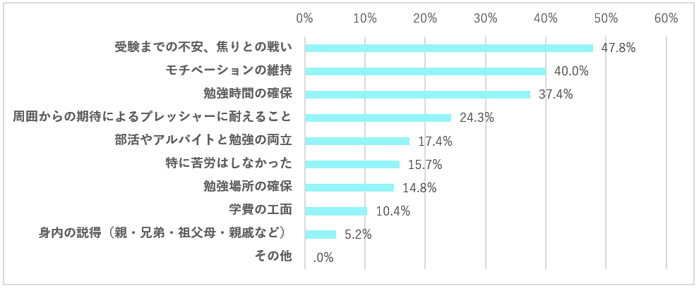「受験までの不安、焦りとの戦い」と回答する割合が最も多く、半数近く(47.8%)となった。また「モチベーションの維持」(40.0%)、「周囲からの期待によるプレッシャーに耐えること」(24.3%)など、精神的な苦労が上位にあがった。一方、「特に苦労はしなかった」という回答も一定数(15.7%)あった。