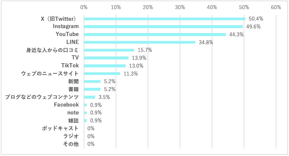医学生が情報収集を行う際に利用しているコンテンツは、1位「X(旧Twitter)」(50.4%)、2位「Instagram」(49.6%)、3位「Youtube」(44.3%)、4位「LINE」(34.8%)の順となり、SNSが上位を占める結果となった。一方、世界中の多くの人々に利用されている「Facebook」の利用率は1%未満(0.9%)となり、同じSNSの「X(旧Twitter)」、「Instagram」、「Youtube」、「LINE」と比較して、医学生の利用率は低い結果となった。