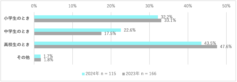 「高校生のとき」が4割強(43.5%)と最も多く、次いで「小学生のとき」(32.2%)、「中学生のとき」(22.6%)の順となった。