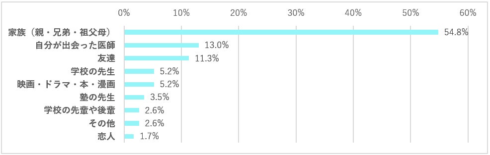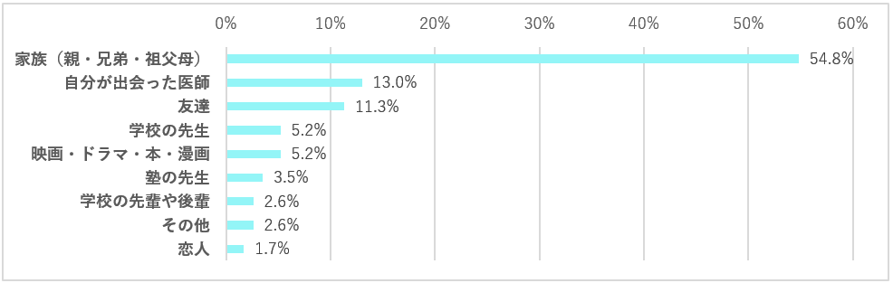 「家族」という回答が圧倒的に多く半数以上(54.8%)となった。次いで、「自分が出会った医師」(13.0%)、「友達」(11.3%)の順となった。
