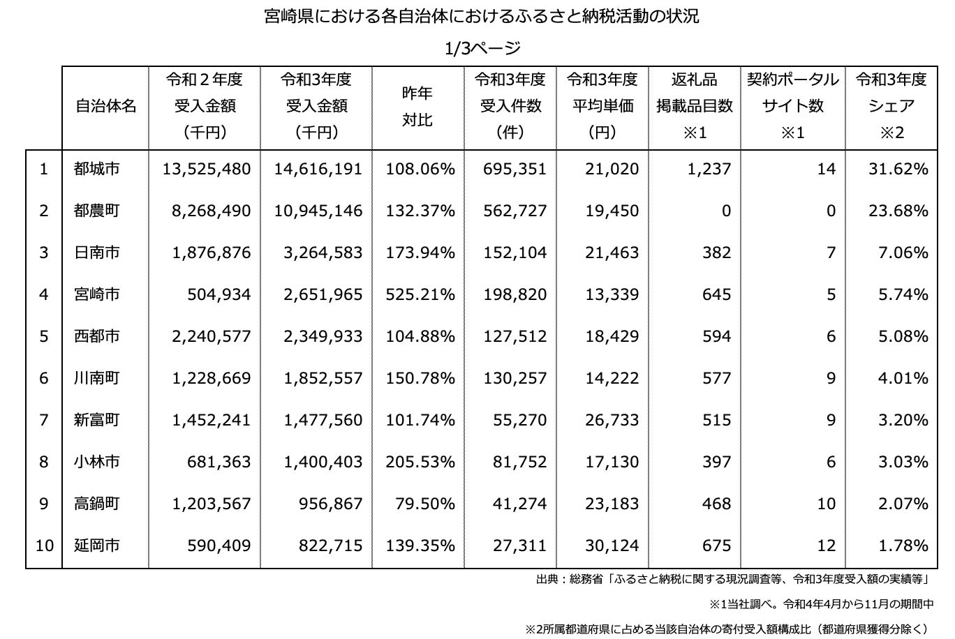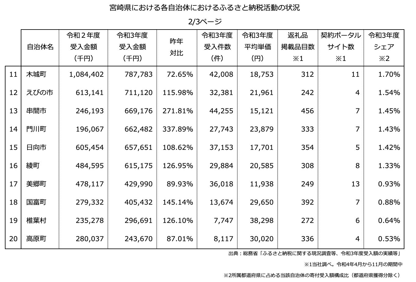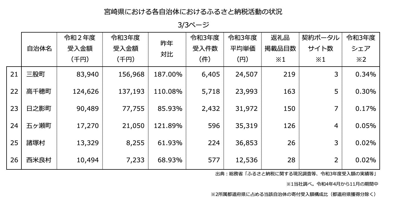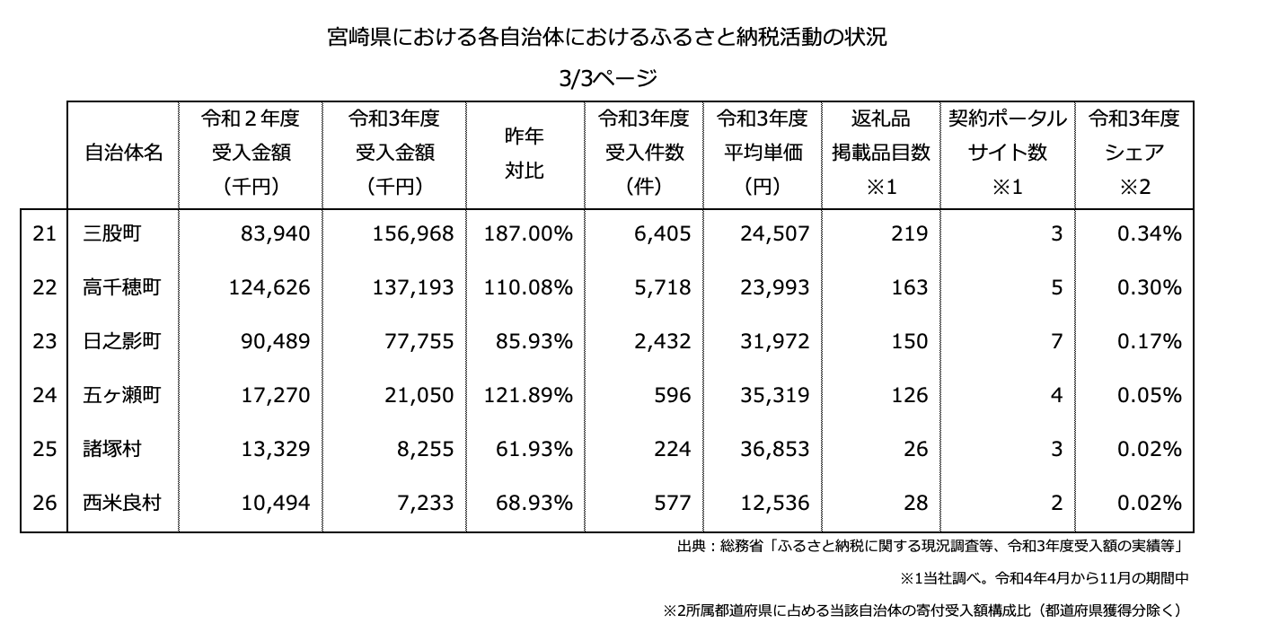 『ふるさと納税分析レポート』令和3年度ふるさと納税寄付額を「宮崎県の20自治体」にて分析しました。最大と最小の自治体で比較すると寄付額の差は2,020倍となりました。