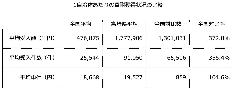 都道府県において寄付額には大きな差があります。また、都道府県の自治体毎に分析をすることで寄付額の現状を把握し、寄付単価や寄付件数なども分析の対象とすることで、ふるさと納税の傾向を探ります。今回は宮崎県を分析します。宮崎県は、ふるさと納税で3度日本一になった都城市や残念ながら指定除外になってしまった都農町など、全国的に有名な自治体が揃っています。では、具体的に見ていきましょう。