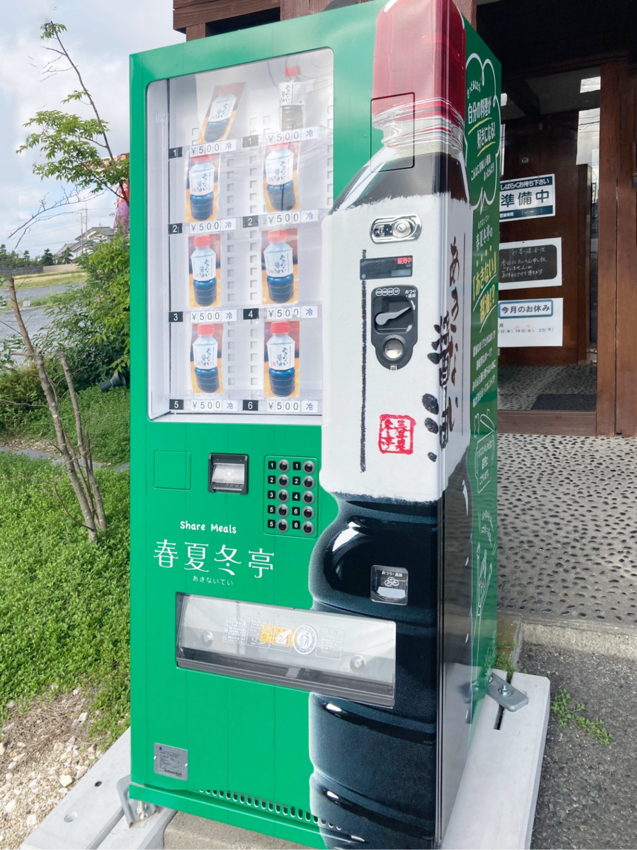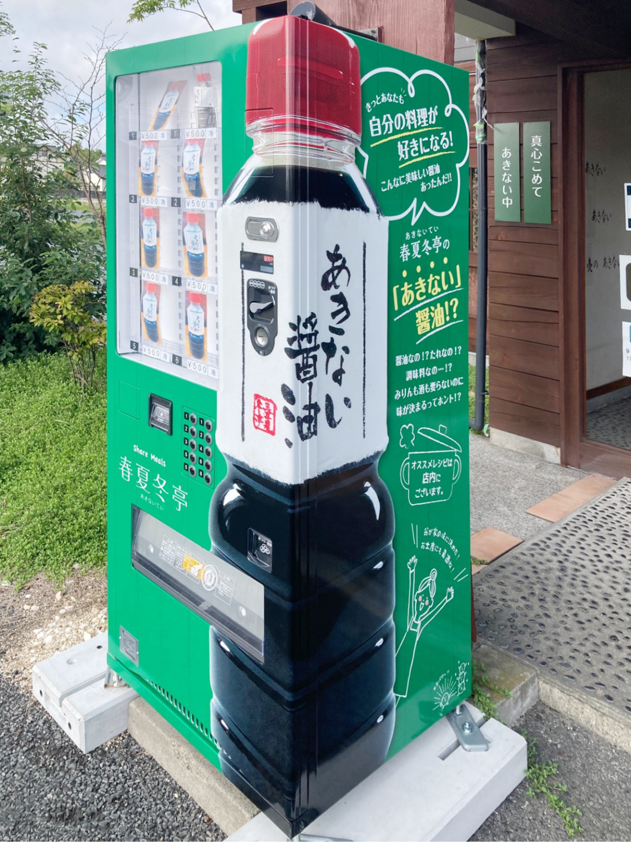 特徴的な緑色をベースとしたこの自販機は、春夏冬亭様のイメージカラーを反映させており、「あきない醤油」の商品写真を大胆に配置したデザインが目を引きます。