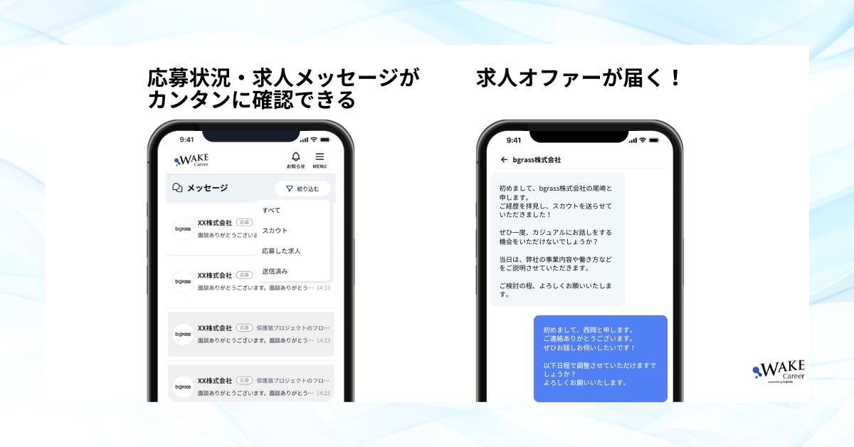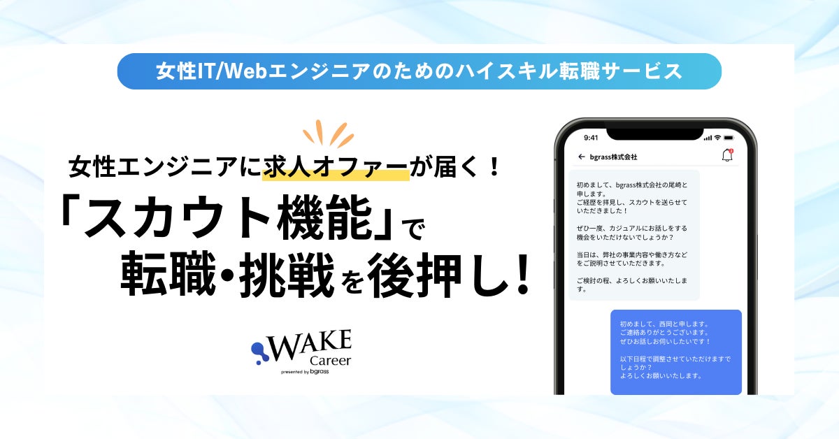 bgrass株式会社(本社:東京都渋谷区 代表取締役:咸 多栄、以下「当社」)が運営する、女性IT/Webエンジニアのためのハイスキル転職サービス『WAKE Career (ウエイクキャリア)』は、求職者に対して興味を持った企業からオファーメッセージが届く「スカウト機能」を2024年10月上旬より提供することをお知らせいたします。