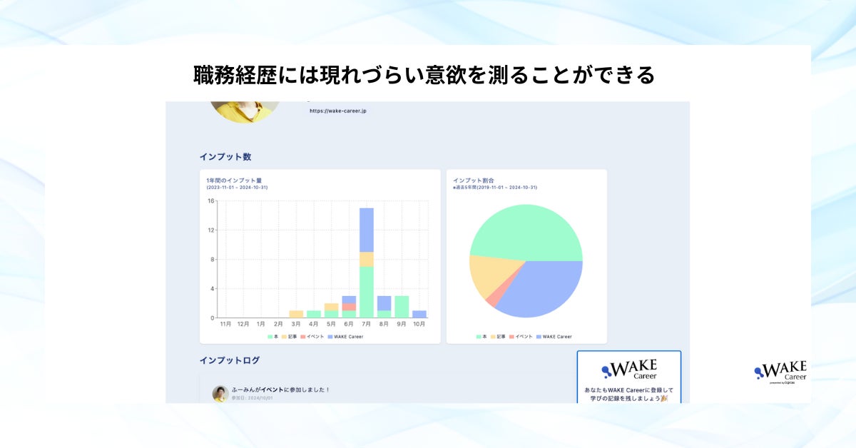 女性エンジニアは社会構造的に、ブログ執筆やカンファレンス登壇などのアウトプットが少なくなる傾向があります。そこで、WAKE Careerは「インプットログ機能」を開発し、技術書の読書や技術イベントへの参加など、これまで評価されにくかった技術インプットを可視化します。これにより、女性エンジニアの継続的な学習努力と蓄積された知識・経験を適切に評価し、転職活動に活かすことができます。