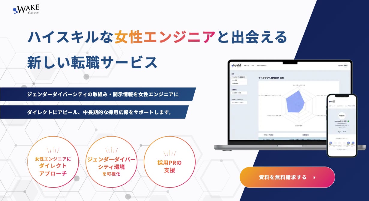 bgrass株式会社は、「ジェンダーギャップを融かす」をミッションに、女性IT/Webエンジニアのためのハイスキル転職サービス「WAKE Career」を提供しています。WAKE Careerは、企業で活躍中の女性エンジニアをメインターゲットに、年収・やりがい・働きやすさを追求したハイスキル転職ができるプラットフォームであり、転職活動における格差やバイアスをテクノロジーにより減らしていくことを目指しています。