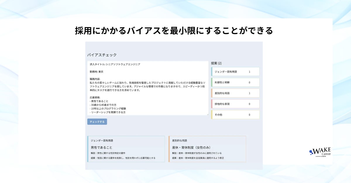 AIバイアスチェッカー:企業がスカウトメッセージを作成する際、AIがバイアスのない文面作成をサポートします。