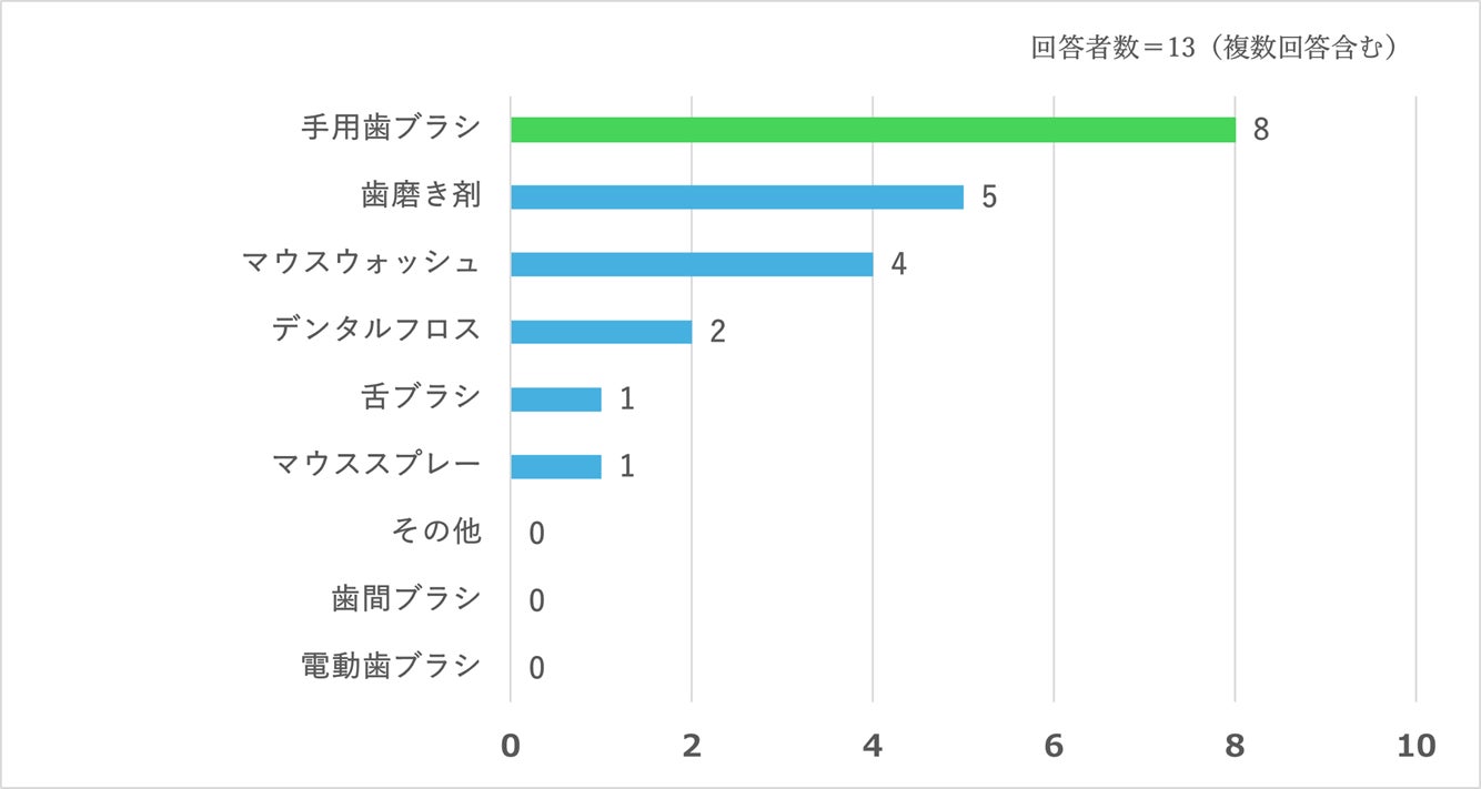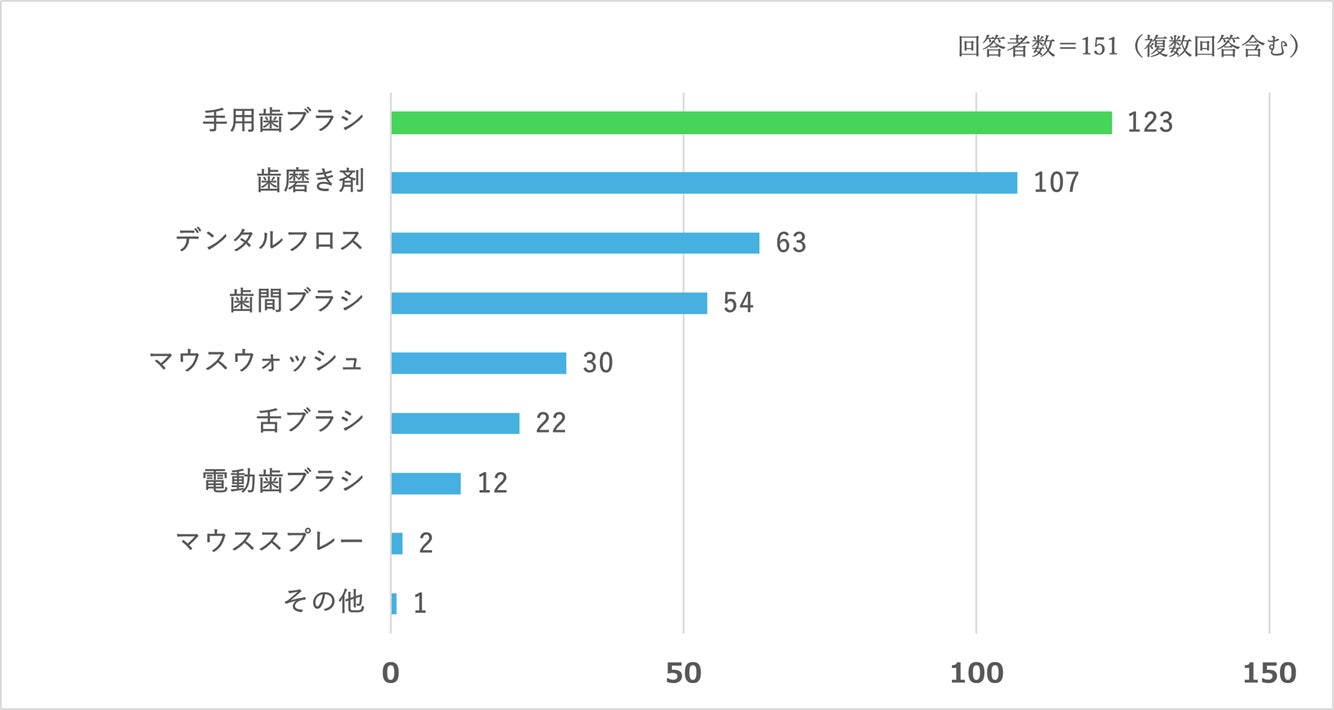 最も多かったのが「手用歯ブラシ」、続いて「歯磨き剤」が2位、「デンタルフロス」が3位という結果になりました。