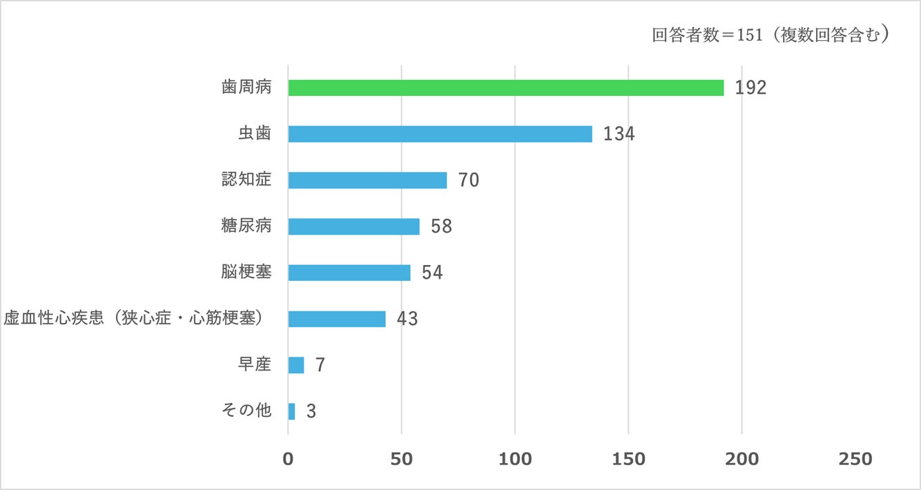 最も多かった回答は「歯周病」で、次いで「虫歯」が2位、「認知症」が3位という結果でした。また、歯の健康が虫歯や歯周病にとどまらず、認知症や糖尿病、脳梗塞、狭心症などにも影響することを認識している方が一定数いることも分かりました。