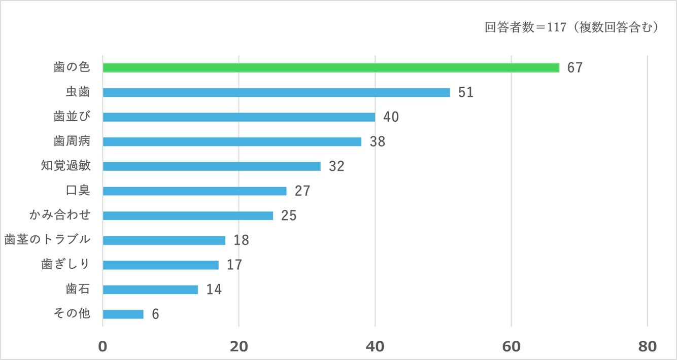 一方で、約8割の方が歯や口に関して何らかの悩みを抱えており、「歯の色」「虫歯」「歯並び」といった美容・健康面の不安に加え、職場や外出先でのケアの難しさ、マスク着用による口臭への気づきなど、生活に根ざした困りごとも多く寄せられました。