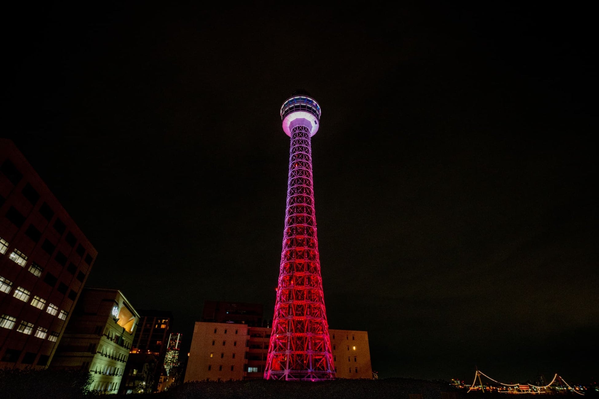 東京リベンジャーズのテーマカラーである赤く染まった横浜マリンタワー
