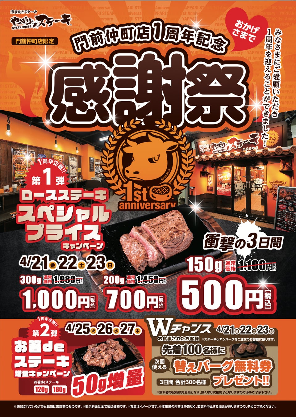 1周年企画第1弾は4月21日〜23日の3日間ロースステーキ150gがなんと500円!