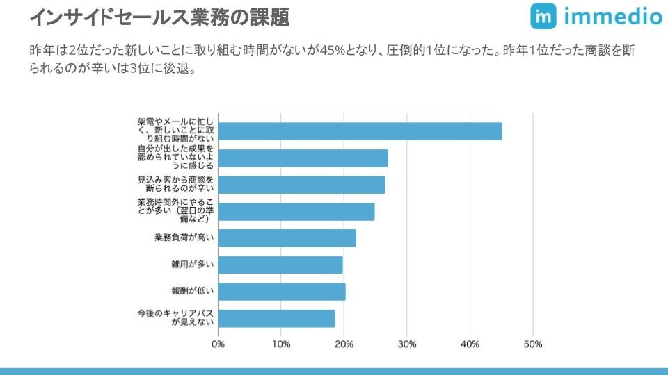 次に希望する職種はマーケティングが最多で、昨年多かった営業を抜いている。また、インサイドセールス業務の課題は「新しいことに取り組む時間がない」が45%で最多となった。