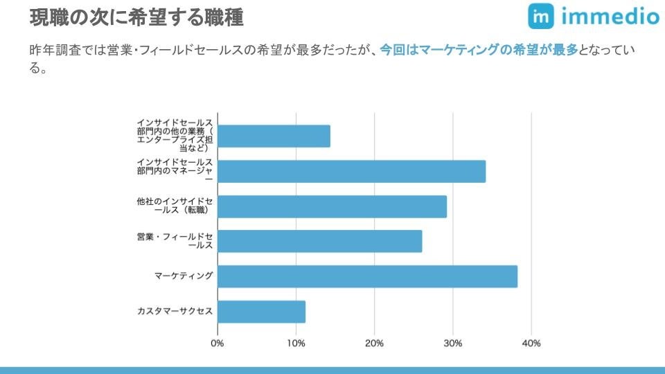 インサイドセールス従事者に、「あなたは次のキャリアではどのような役職にチャレンジしてみたいと考えていますか?」と質問したところ、最も多かったのはマーケティングで、次がインサイドセールス部門内のマネージャーでした。