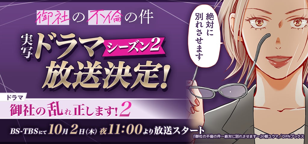 DPNブックスの人気作品『御社の不倫の件~絶対に別れさせます~』(著:樹ユウマ)の実写ドラマシーズン2の放送を記念し、各電子書店での無料話増量キャンペーン、なにとぞ編集部公式Xでのプレゼントキャンペーンなど様々なキャンペーンを開催中です!
