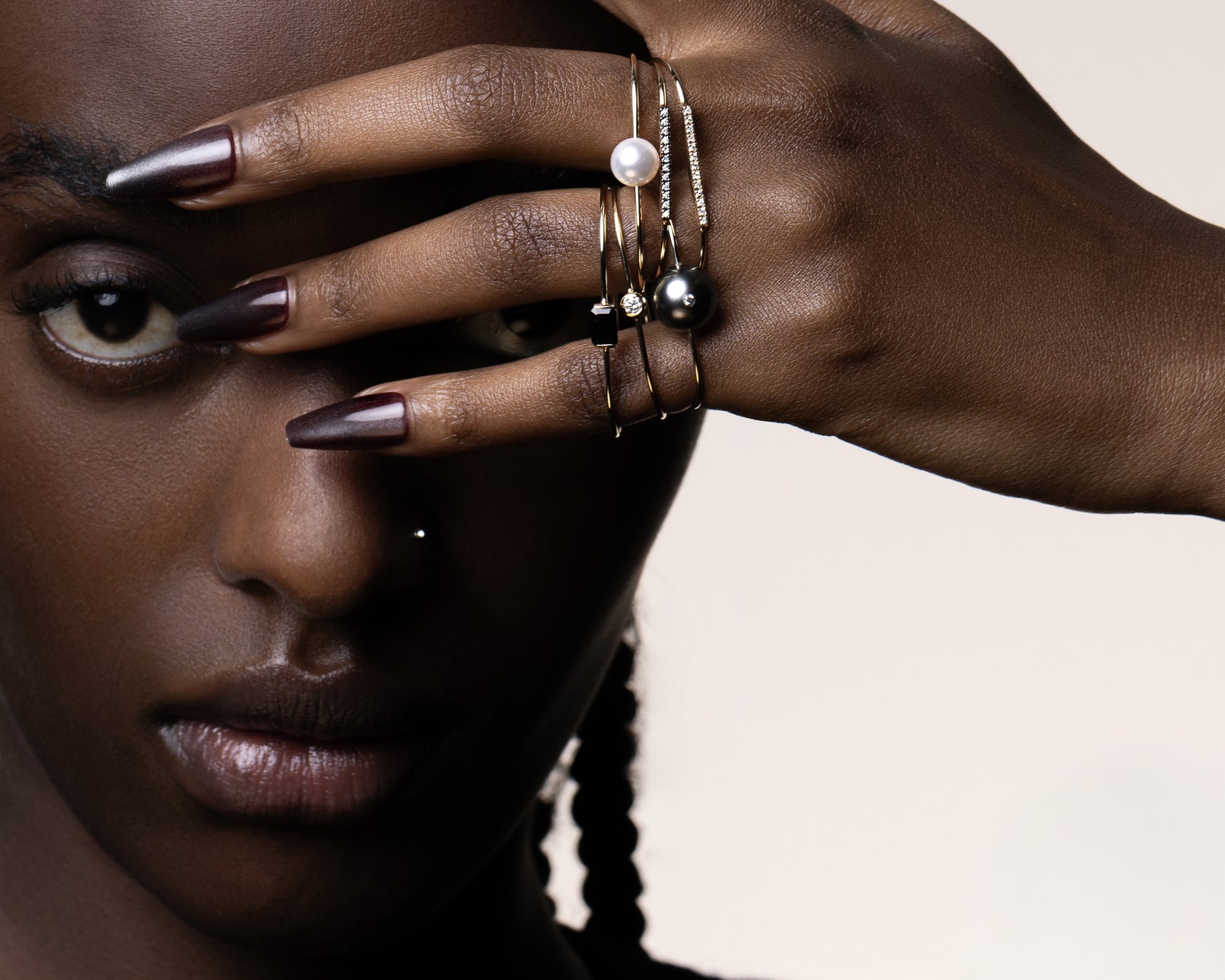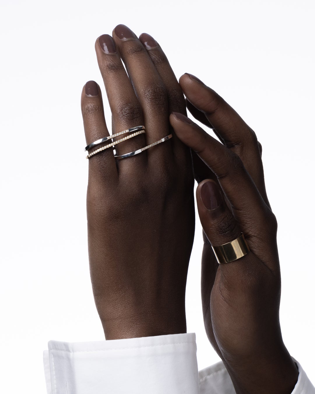 直線や円、幾何学モチーフを組み合わせ詩の世界を描こうとしたミロの作品からインスパイア。ダブルフィンガーリングの中央に配されたダイヤモンドは、まるで私的なアイコンのよう。さりげないモード感が光るスタイリングに。