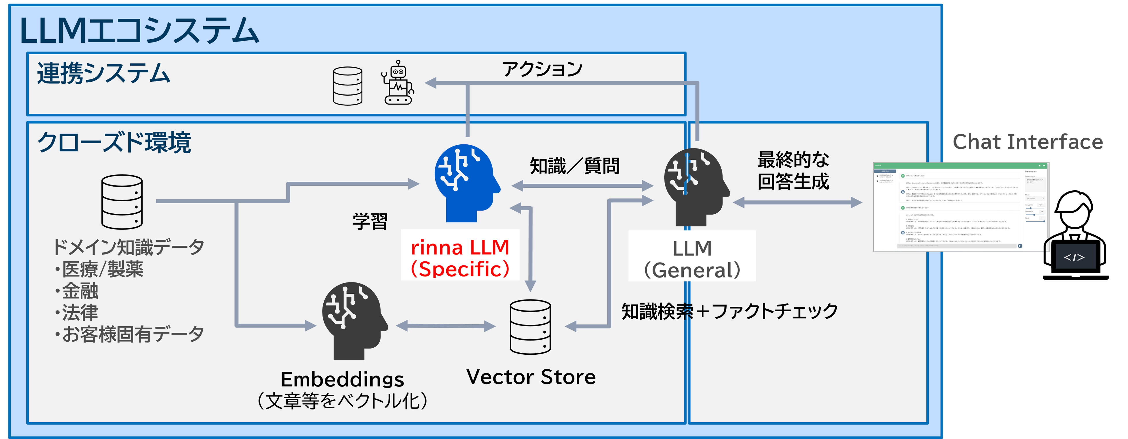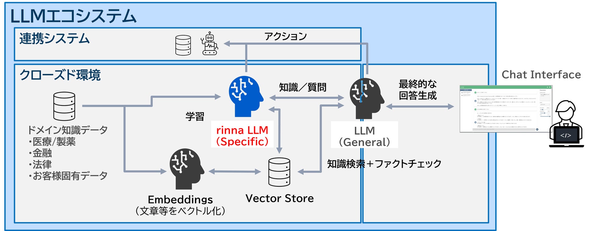 今回の協業は、多くの日本語の学習データで開発されたrinnaのLLMをベースに、企業の業務に特化した生成AI環境を構築・開発するものです。rinnaはこれまでに日本語に特化した13億パラメータの生成AI(GPT:Generative Pre-trained Transformer)を開発し、5月には36億パラメータのLLMをオープンソースで公開しています。rinnaのLLMは、日本語環境での活用に適していることに加え、オンプレミスでの構築が可能なため、社内のネットワーク上で安全に構築し管理することができます。また、お客様の企業データでファイン・チューニングを施すことで、業務に特化したLLMを開発することができます。rinnaのLLMと周辺技術をベースに、お客様独自の生成AIシステムを提供していきます。