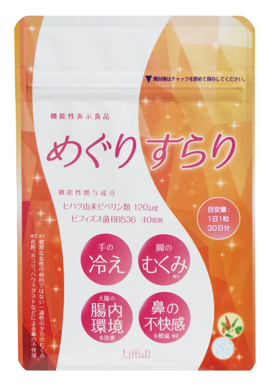 株式会社河野メリクロン(本社:徳島県美馬市、代表取締役社長:河野 圭佑)は、「美と健康の創造」をテーマにした新ブランド「Liffull(リフル)」から、機能性表示食品「めぐりすらり」を2023年10月6日に発売いたします。日本初※1「手の冷えを軽減」「脚のむくみを軽減※2」「大腸の腸内環境改善」「鼻の不快感を軽減※3」の4つの機能を持つサプリメントです。