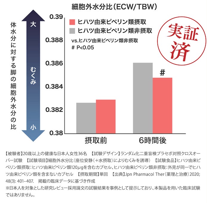 本品にはヒハツ由来ピペリン類、ビフィズス菌BB536が入っています。ヒハツ由来ピペリン類は、脚のむくみが気になる健常な女性の夕方の脚のむくみ(病的ではない一過性のむくみ)を軽減する機能があることが報告されています。また、冷えにより低下した血流(末梢血流)を正常に整え、冷えによる末梢(手)の皮膚表面温度の低下を軽減する機能があることが報告されています。ビフィズス菌BB536には、花粉、ホコリ、ハウスダストなどによる鼻の不快感を軽減する機能や、大腸の腸内環境を改善し、腸の調子を整える機能が報告されています。