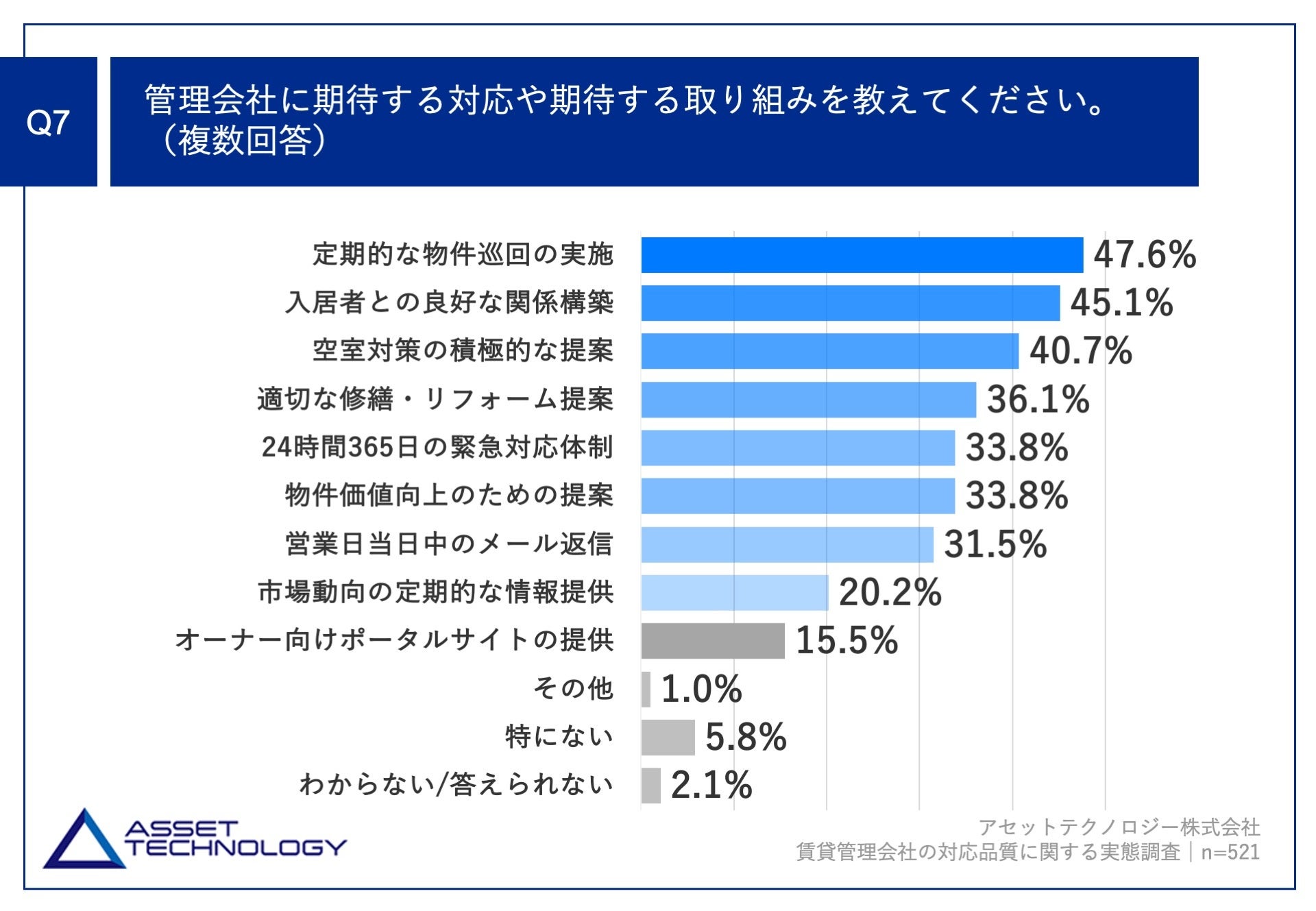 「Q7.管理会社に期待する対応や期待する取り組みを教えてください。(複数回答)」(n=521)と質問したところ、「定期的な物件巡回の実施」が47.6%、「入居者との良好な関係構築」が45.1%、「空室対策の積極的な提案」が40.7%という回答となりました。