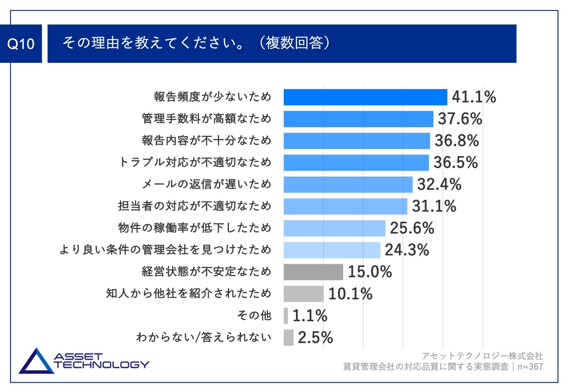Q9で「変更したことがある」「変更を検討中である」「変更を検討したことはあるが変更していない」と回答した方に、「Q10.その理由を教えてください。(複数回答)」(n=367)と質問したところ、「報告頻度が少ないため」が41.1%、「管理手数料が高額なため」が37.6%、「報告内容が不十分なため」が36.8%という回答となりました。