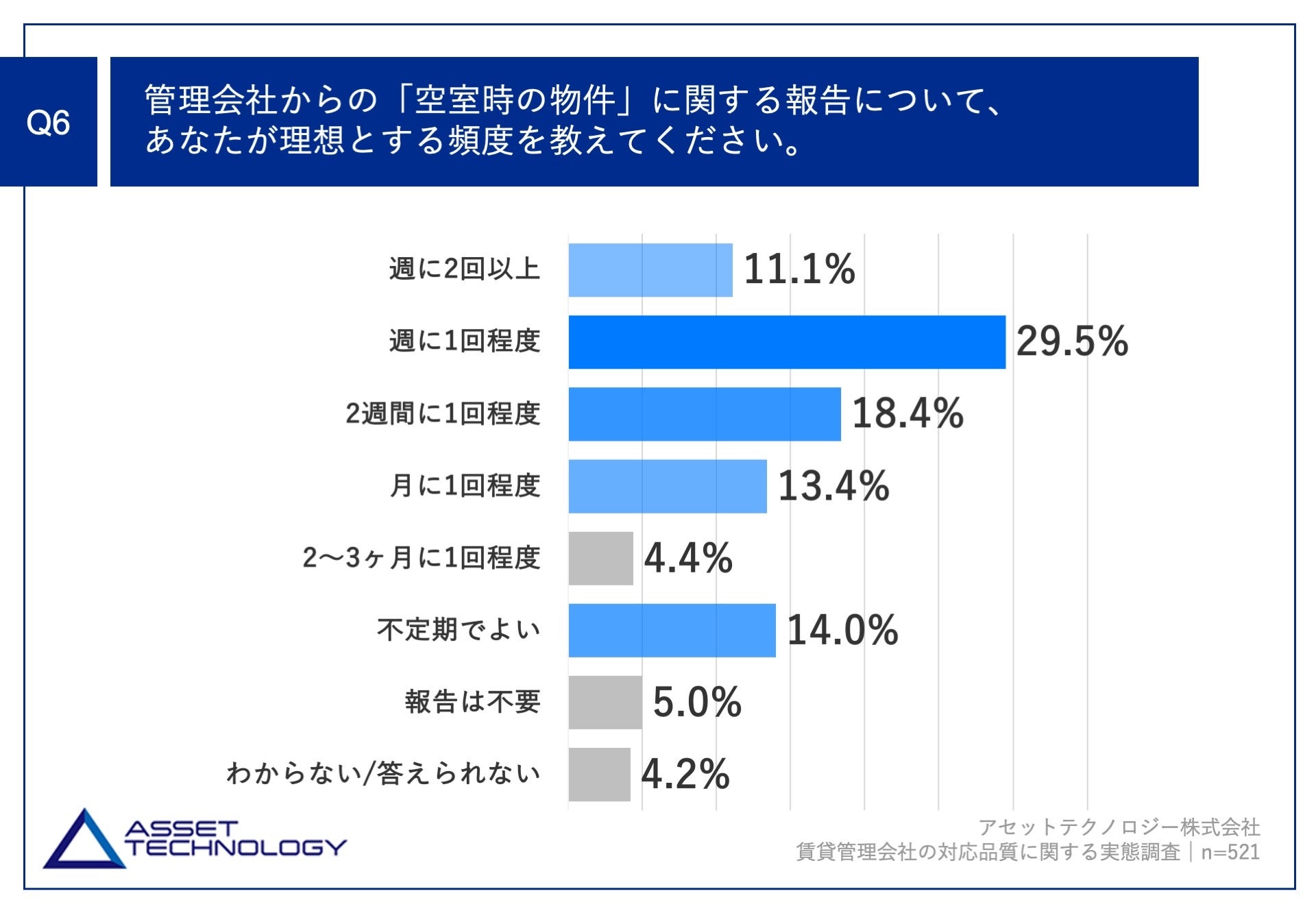 「Q6.管理会社からの「空室時の物件」に関する報告について、あなたが理想とする頻度を教えてください。」(n=521)と質問したところ、「週に1回程度」が29.5%、「2週間に1回程度」が18.4%、「不定期でよい」が14.0%という回答となりました。