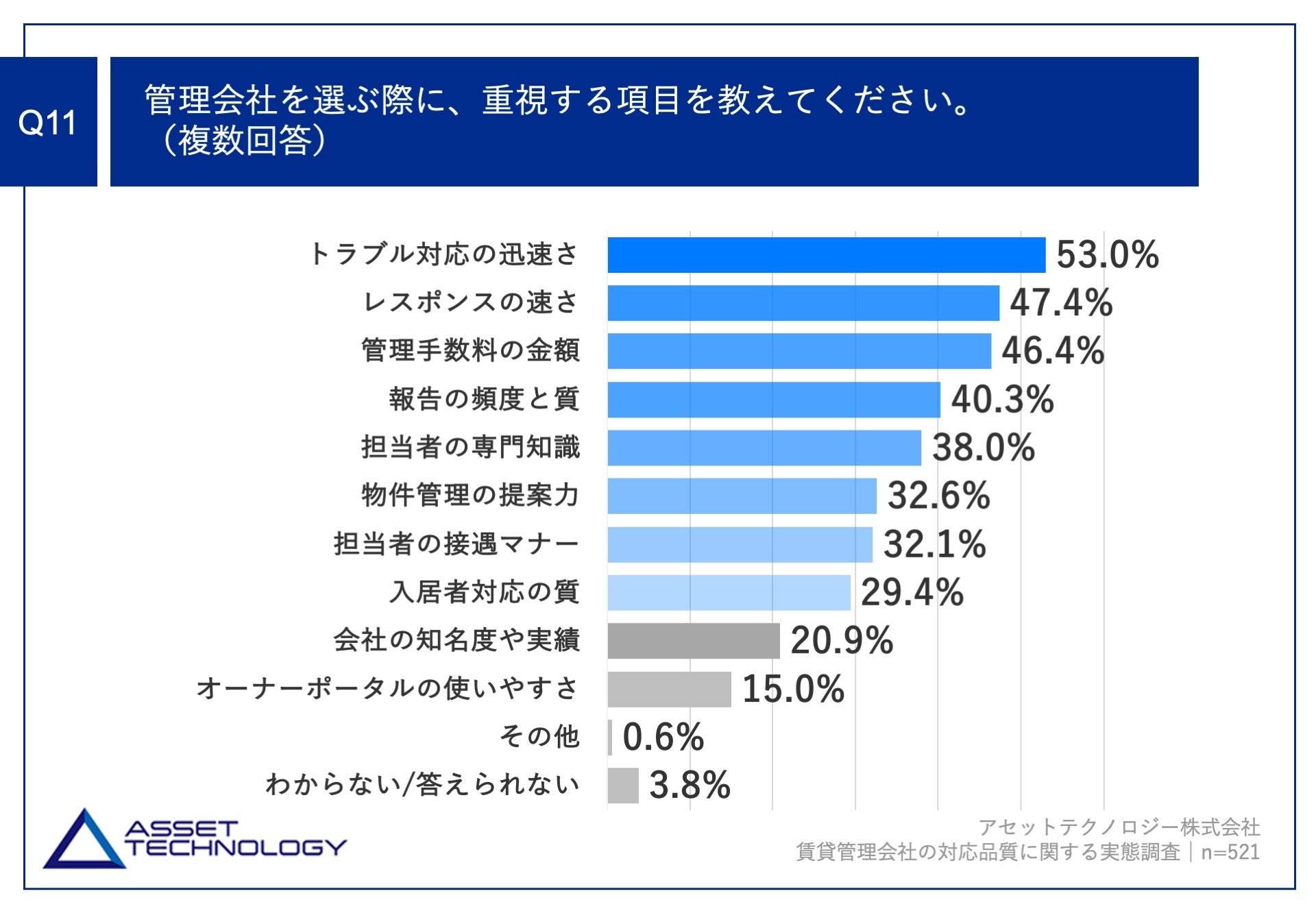 「Q11.管理会社を選ぶ際に、重視する項目を教えてください。(複数回答)」(n=521)と質問したところ、「トラブル対応の迅速さ」が53.0%、「レスポンスの速さ」が47.4%、「管理手数料の金額」が46.4%という回答となりました。