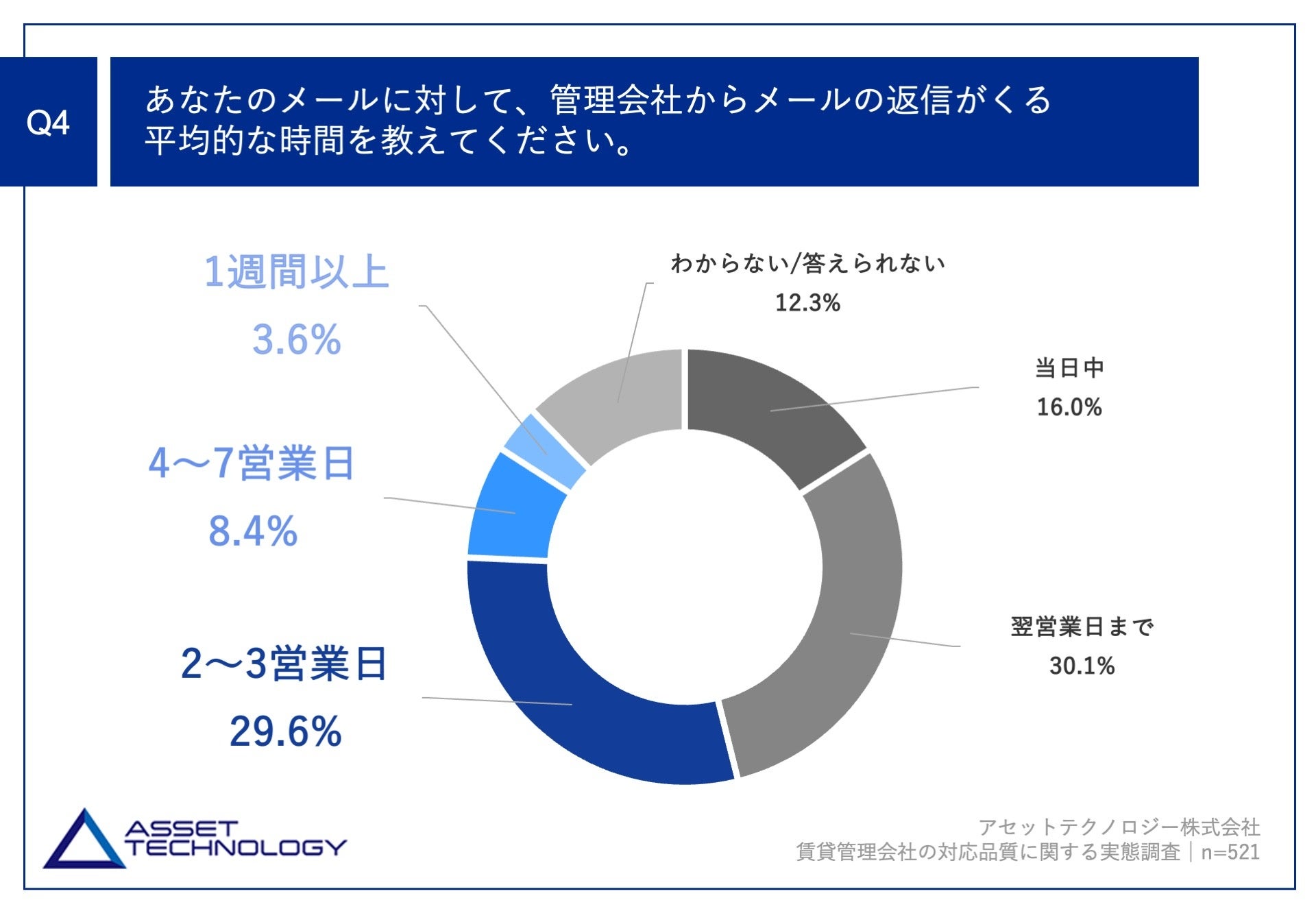「Q4.あなたのメールに対して、管理会社からメールの返信がくる平均的な時間を教えてください。」(n=521)と質問したところ、「翌営業日まで」が30.1%、「2~3営業日」が29.6%という回答となりました。