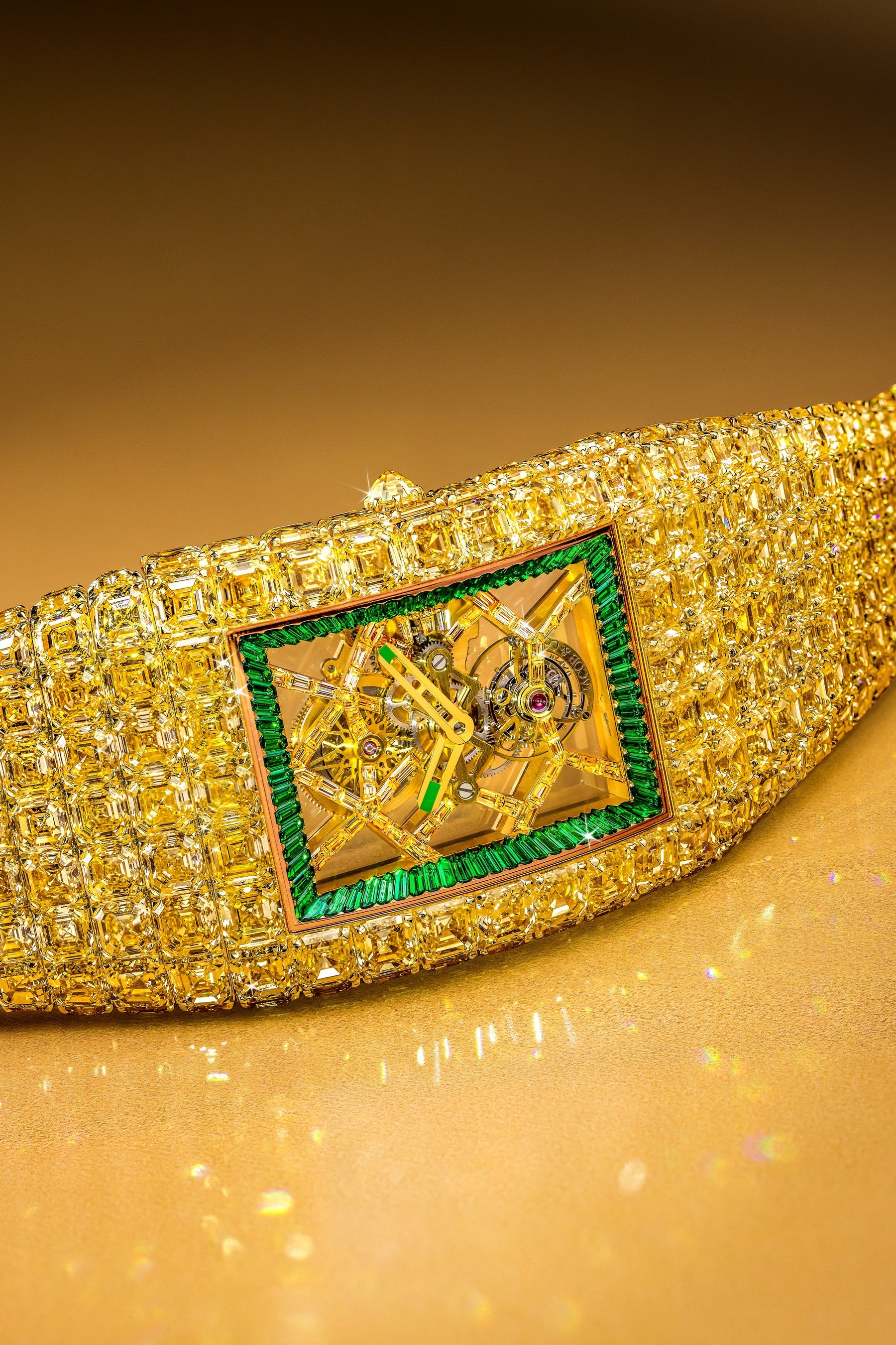 ジュエリーの系譜を受け継ぐジュエリーウォッチラインにおいて、ジェイコブ&コーは他の追随を許さぬ存在感を放っています。その最高峰として発表された「ビリオネア タイムレス トレジャー」は、482個・合計216.89カラットにも及ぶイエローダイヤモンドを贅沢に使用し、圧倒的な輝きを誇ります。さらに注目すべきは、その華麗な外観に秘められた高度な時計技術。スケルトン構造のケース内部には、フライングトゥールビヨンを備えた精緻なムーブメントが搭載され、ジュエリーとオートオルロジュリー(高級機械式時計)の融合という、ジェイコブ&コーならではの美学が体現されています。まさに、比類なきクラフツマンシップが生んだ至高のタイムピースです。