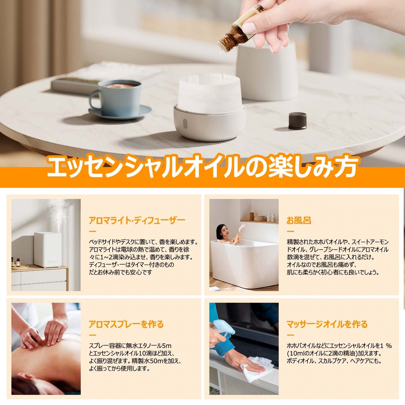 A1: オレンジ精油は、リラックス効果があり、ストレスを緩和する香りとして知られています。ラベンダー精油は、穏やかで花の香りがあり、ストレスや不安を和らげる効果があります。両方の精油は、アロマディフューザーや加湿器に使用することができます。