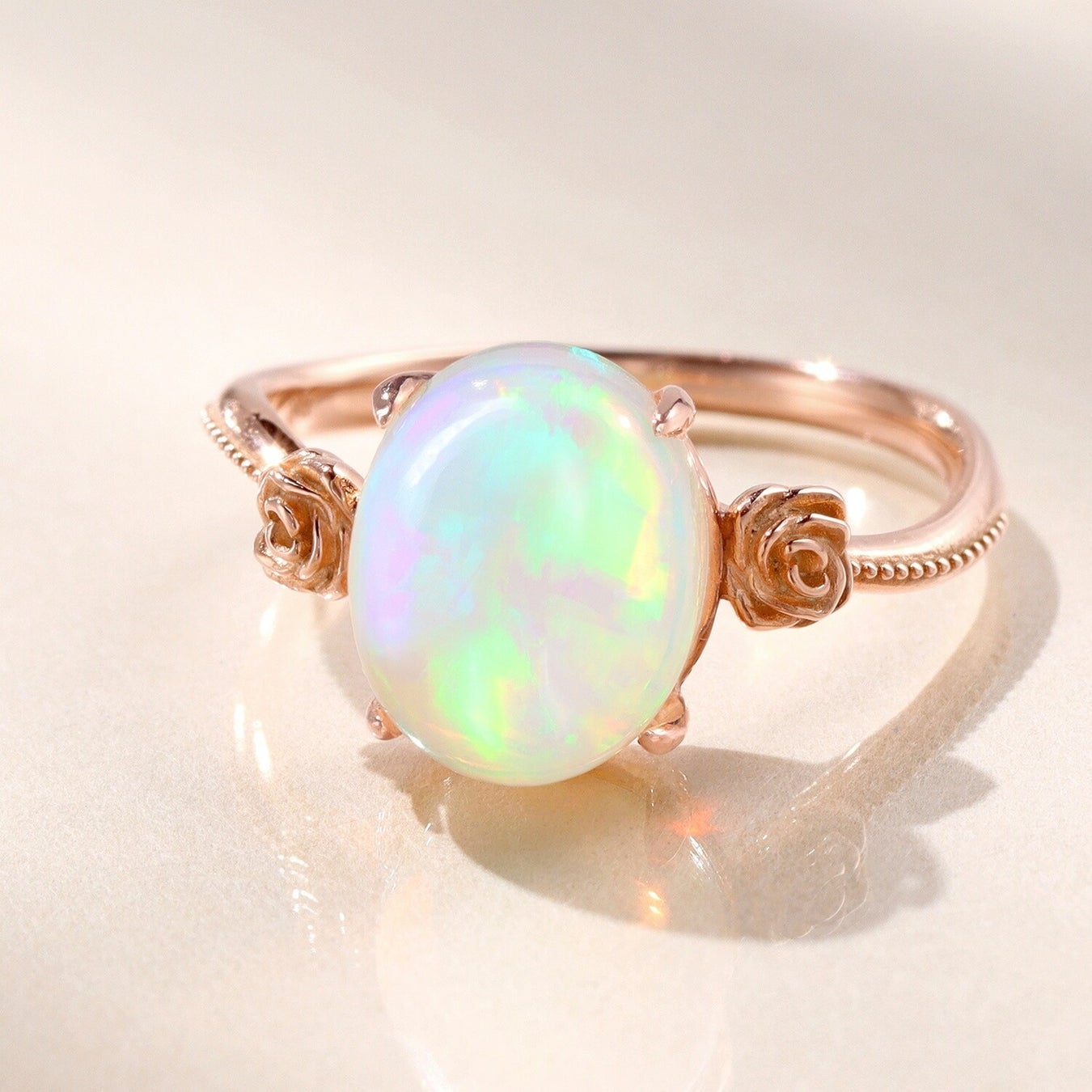 七色に輝くレインボーローズをイメージして、エチオピア産厳選オパールとバラを組み合わせたエレガントなリングをおつくりしました。