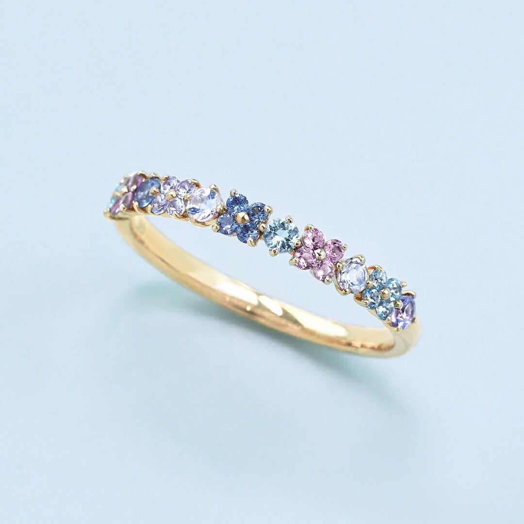 グラデーションのような色彩とちいさな花が集まった可憐な姿は、ちょっぴり気持ちが落ち込みがちな雨の日を楽しませてくれる存在。そんな愛らしい花を指先で愛でる、ハーフエタニティリングで梅雨を楽しみませんか?