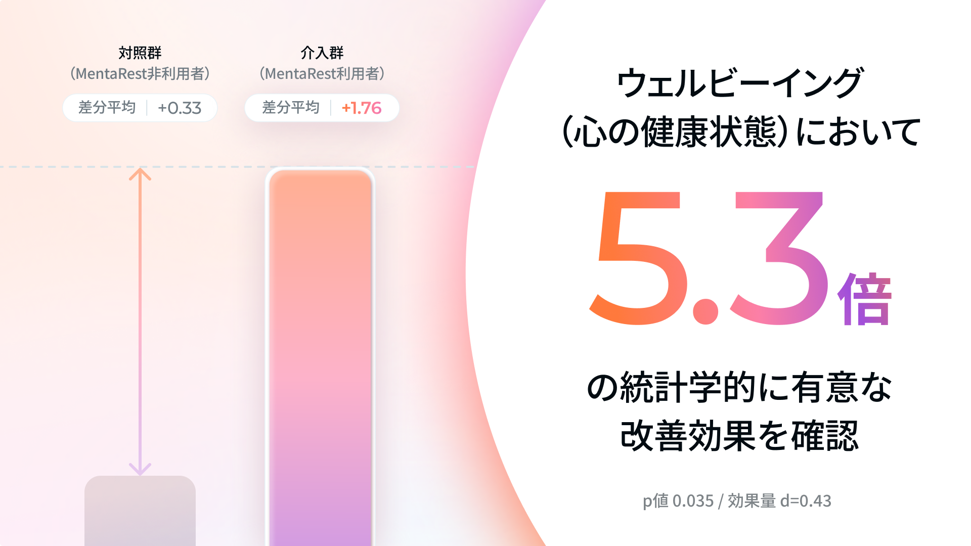 p=0.0348、効果量 d=0.43 (対照群比で約5.3倍の改善)