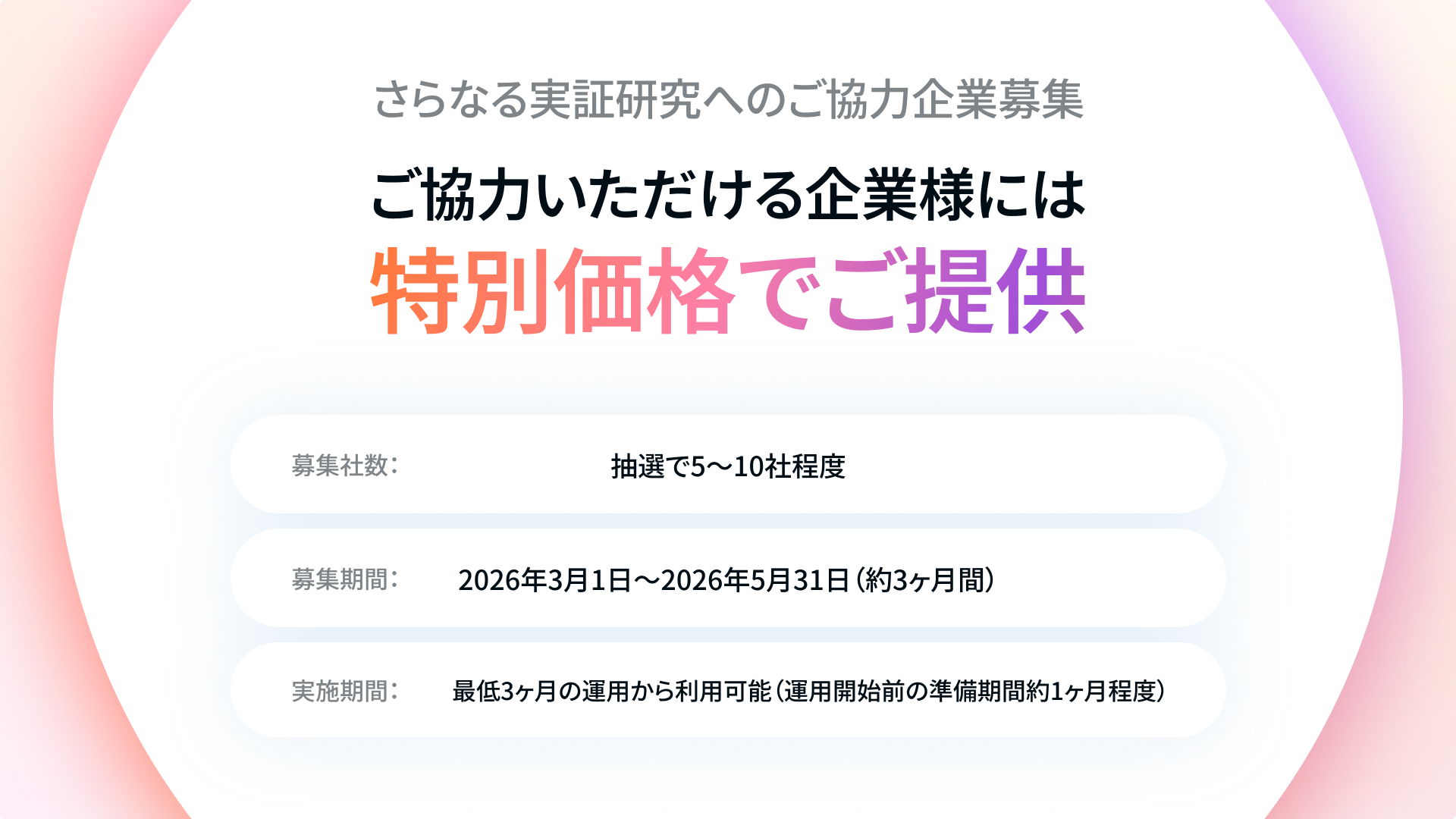 今回の実証結果を受けて、さらなるエビデンス構築とサービス改善を目的に、実証研究にご協力いただける企業様を募集します。ご協力企業様には特別価格での提供を実施いたします。
