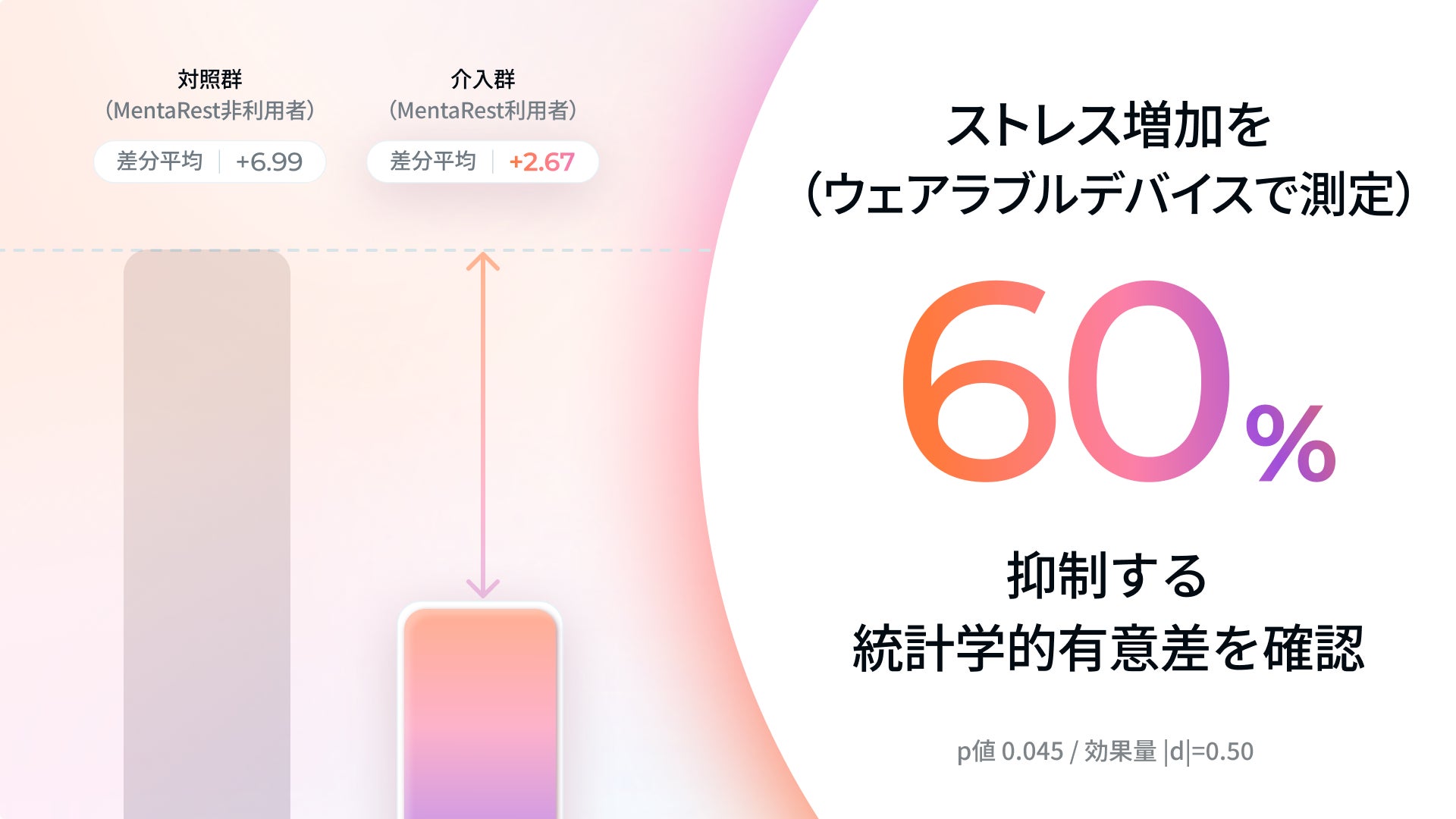 p=0.0447、効果量 d=-0.50(|d|≈0.50)(対照群と比較して約62%のストレス増加抑制)