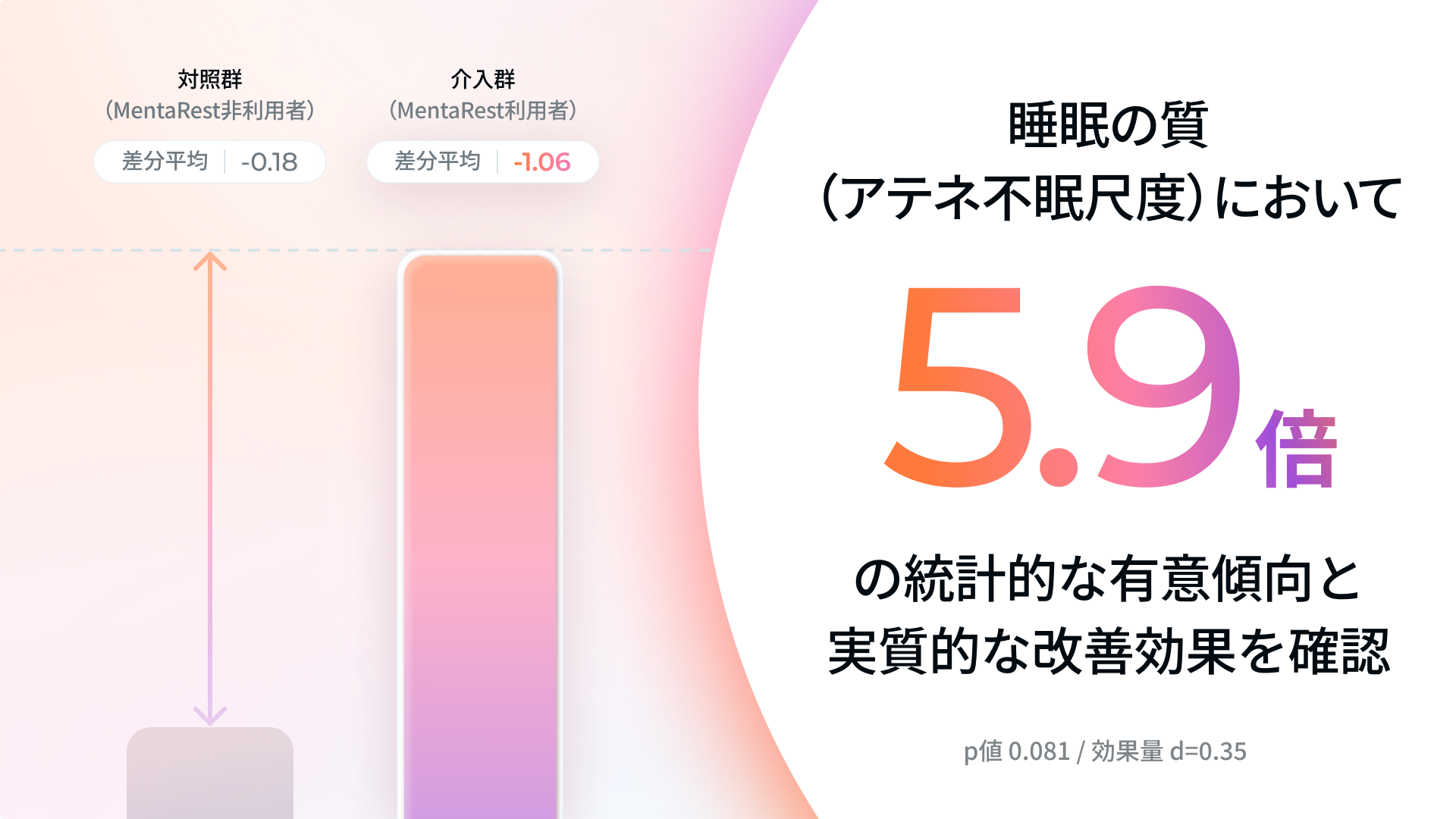 p=0.0806、効果量 d=0.35 (対照群比で約5.9倍の改善)