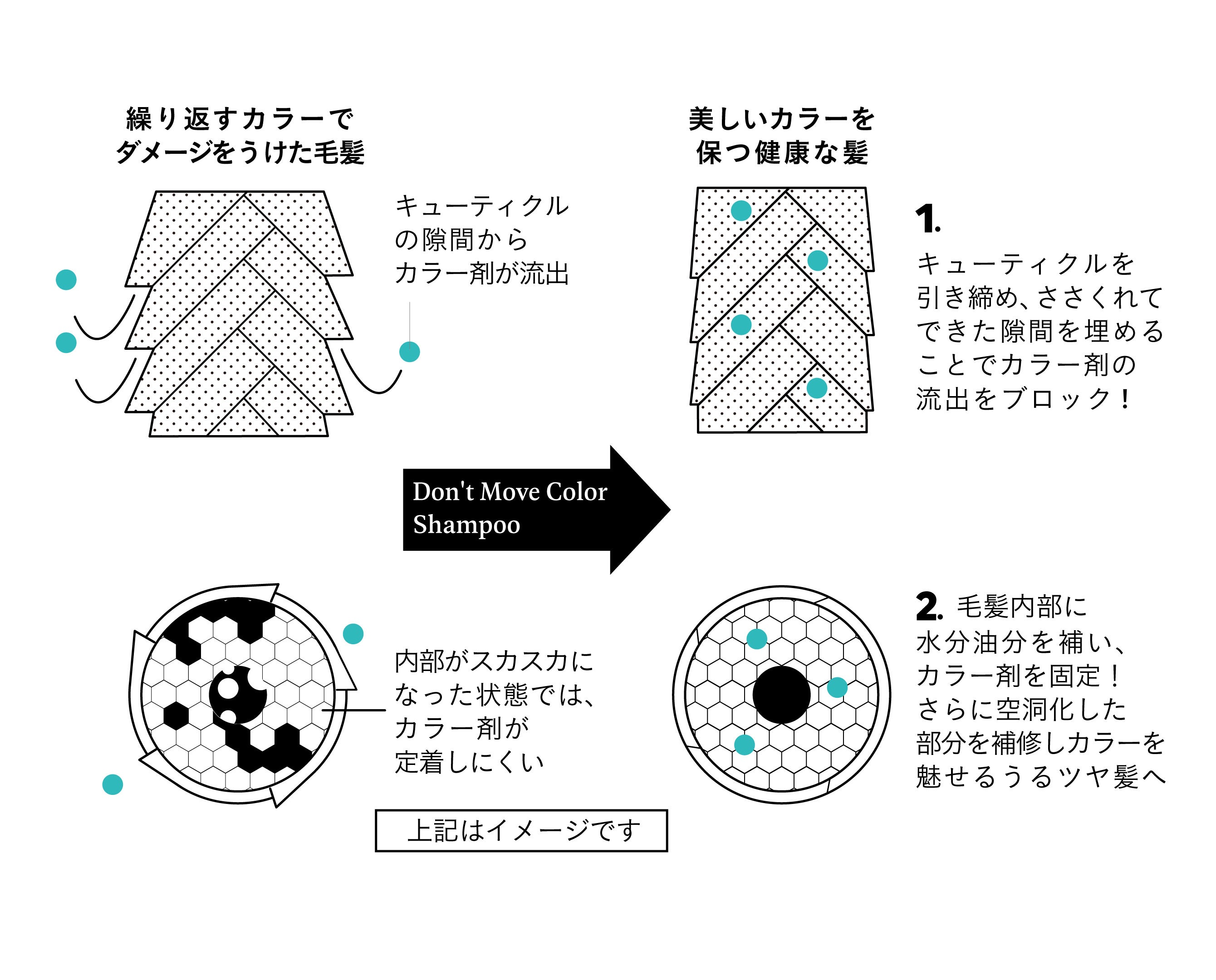 ドント ムーブ カラー シャンプーは毛髪の3層にアプローチする「3Layars-Advance」処方※¹をさらパワーアップさせ、染めたての美しいカラーを持続させるために開発したシャンプー。カラー後の毛髪はキューティクルがゆるみがち。ゆるんだその隙間からカラー剤が流出していきます。本来の健やかな髪に立て直すために、毛髪の