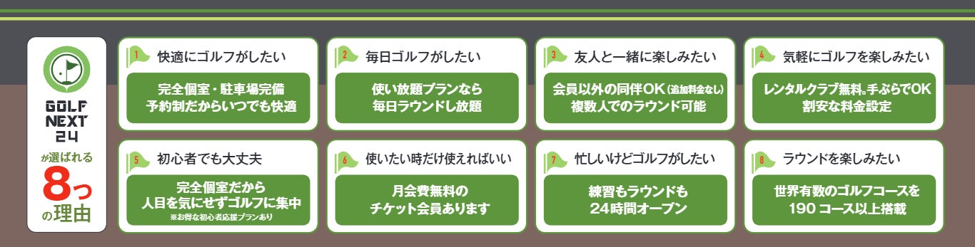 GOLF NEXT 24は、ゴルフを愛する方のためにつくられた「リーズナブルな大人の遊び場」です。