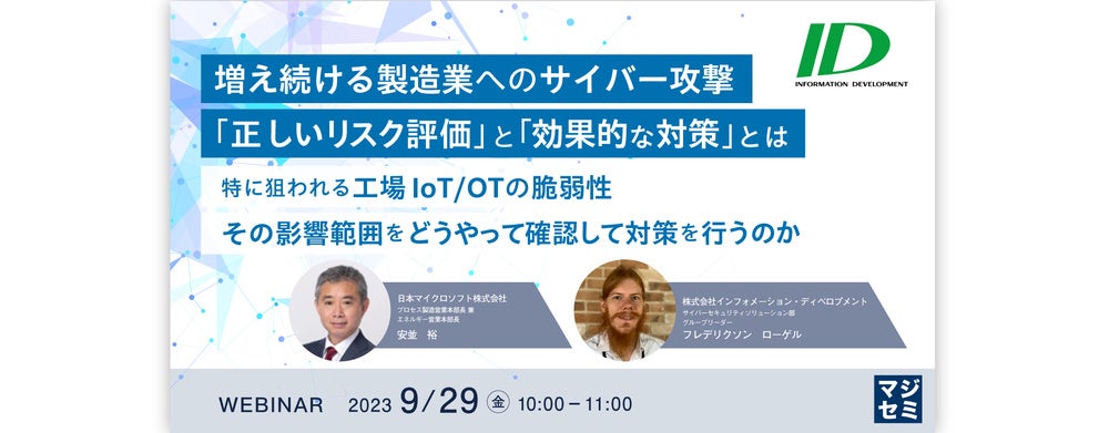 本セミナーでは、増え続ける製造業へのサイバー攻撃に対して、どのようにリスクを可視化し評価するのか、どんな対策を取ればよいのかを、具体的な対策方法について詳しくご説明いたします。