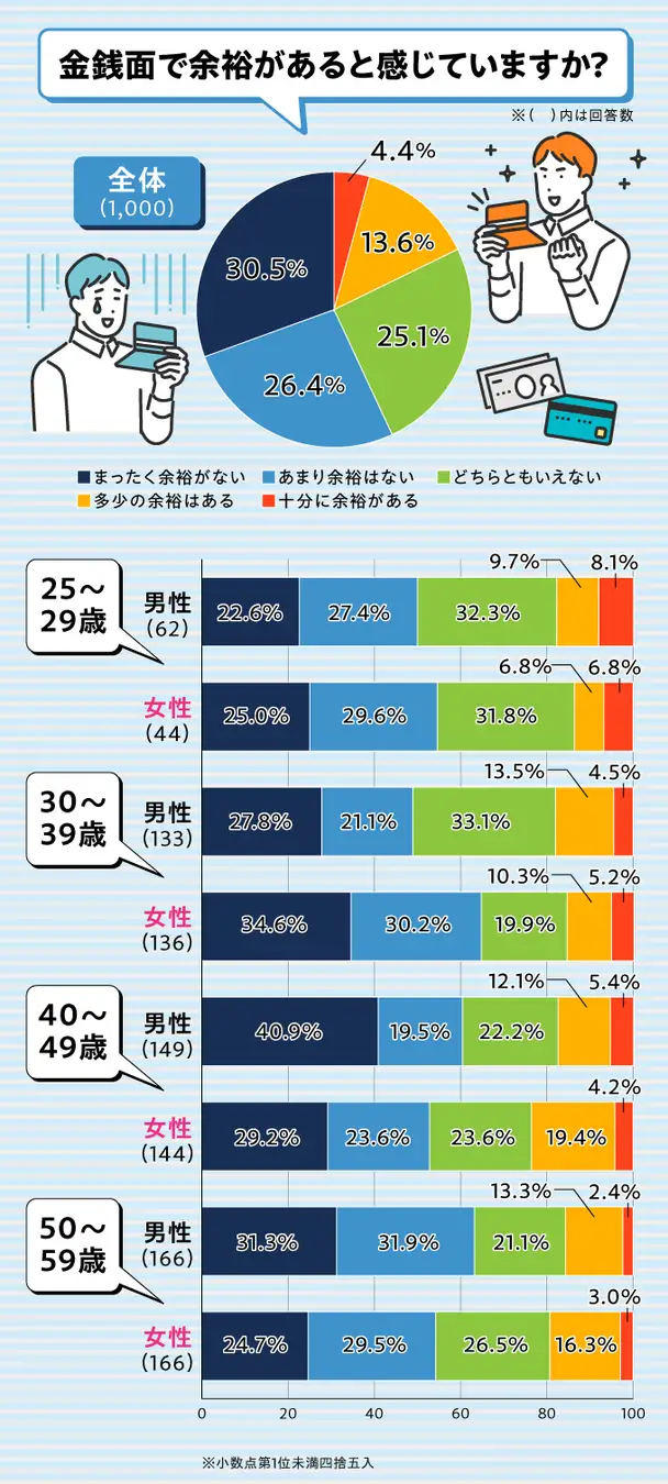 「まったく余裕がない」(30.5%)と「あまり余裕はない」(26.4%)をあわせると、56.9%の人がお金に余裕がないと感じていることがわかりました。