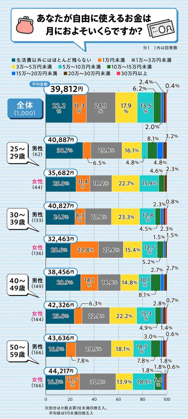 回答をもとに平均を算出すると、月に自由になるお金の平均は全体で39,812円でした。