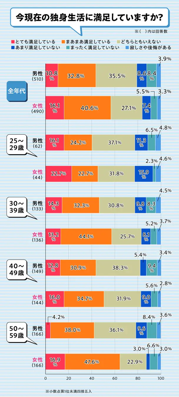 女性は「とても満足している」が16.1%、「まあまあ満足している」が40.6%でした。合計すると、女性の56.7%が独身生活に満足していることがわかりました。