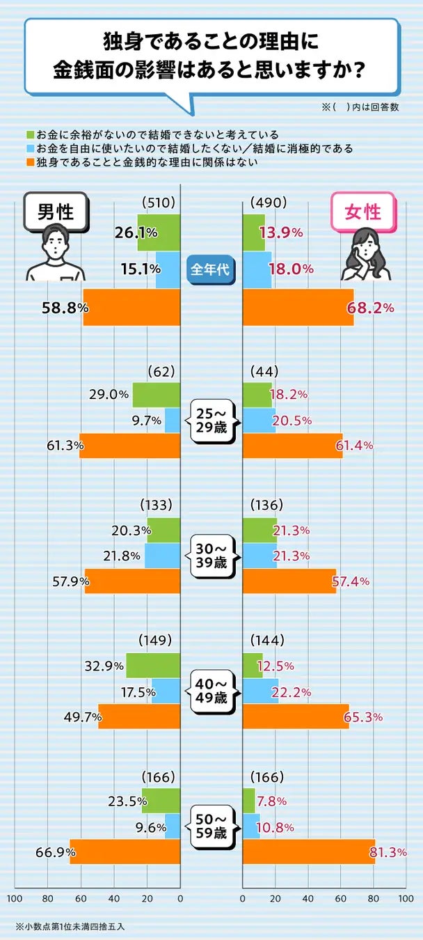 男性の58.8%と女性の68.2%が、お金がないから結婚できないとは考えていないようです。