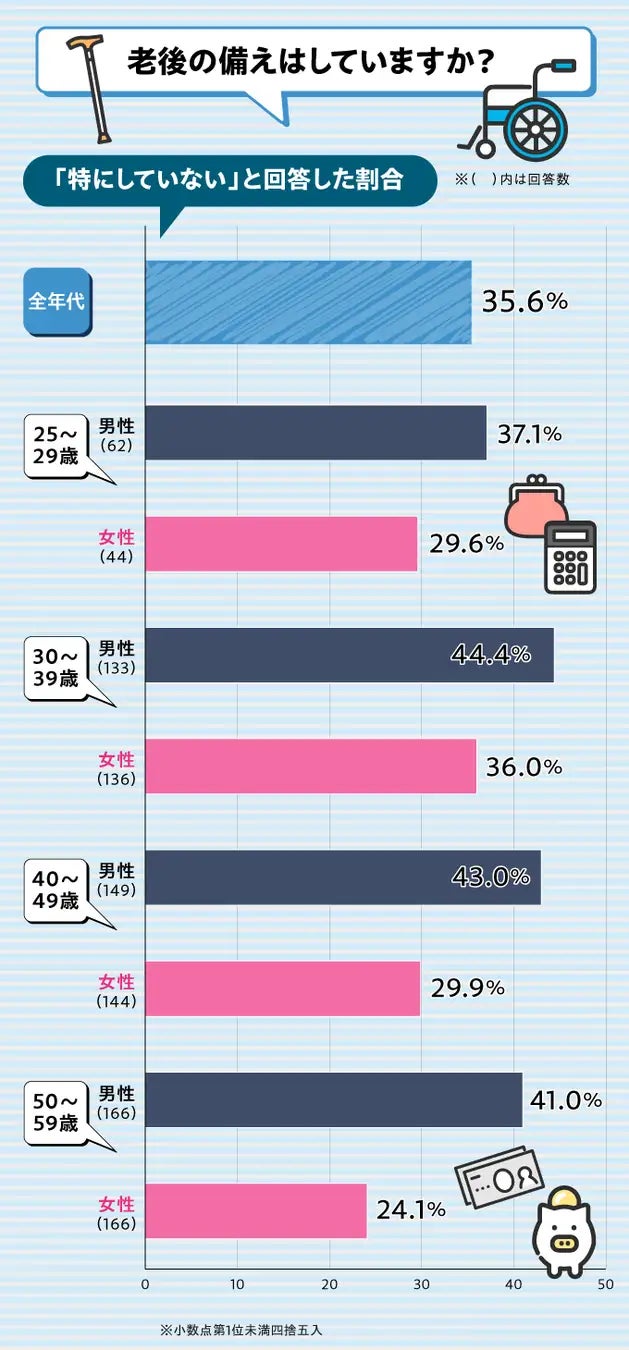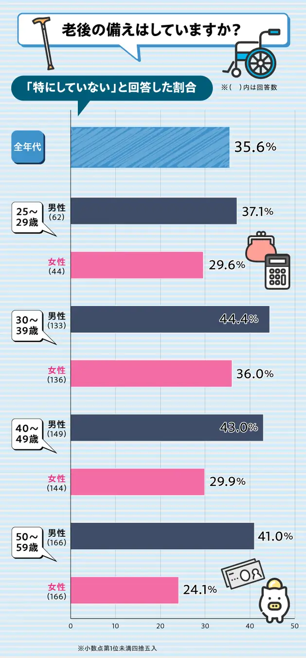 まだ老後まで時間がある20代はともかくとしても、30代・40代・50代いずれの年代も老後の備えをしていない男性は40%を超えていました。