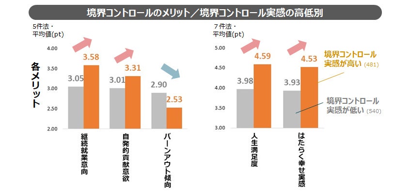 境界コントロール実感が高いと、継続就業意向や自発的貢献意欲、人生満足度やはたらく幸せ実感が高い。一方で、バーンアウト(燃え尽き)傾向が低い。