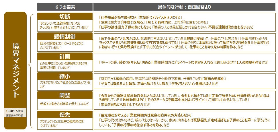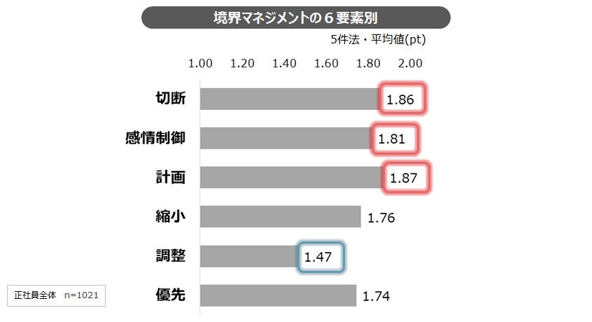 個人が仕事と私生活をうまく切り分けるための方策を境界マネジメントとして測定し※1、因子分析を行った結果、以下6つの要素が抽出された。これらの6つの要素の平均値を「境界マネジメント」として分析。