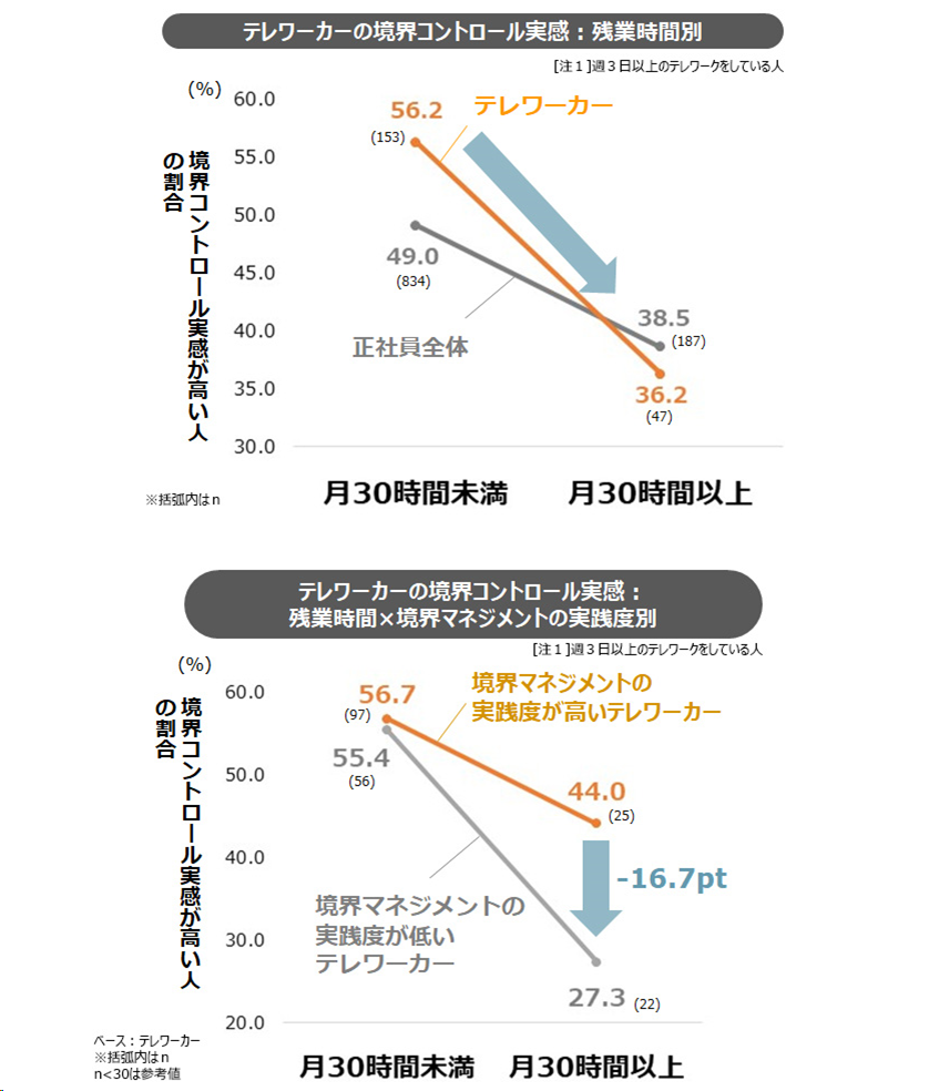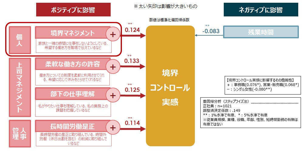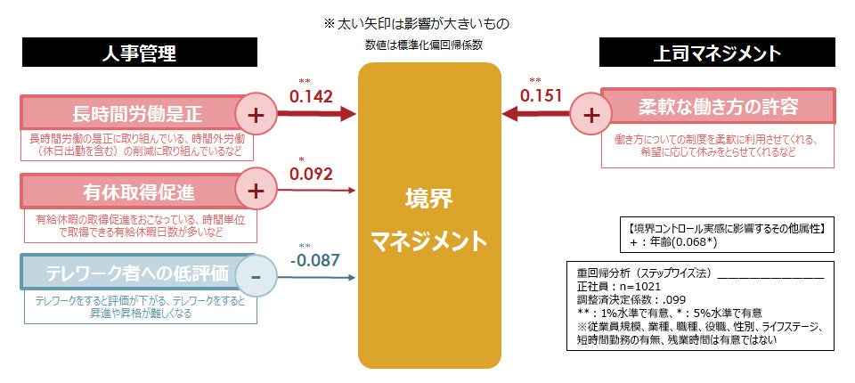 個人が境界マネジメントを実践することに加えて、上司が柔軟な働き方を許容することや部下の仕事を理解していること、長時間労働是正、残業時間が短いことが境界コントロール実感にプラスに影響している。