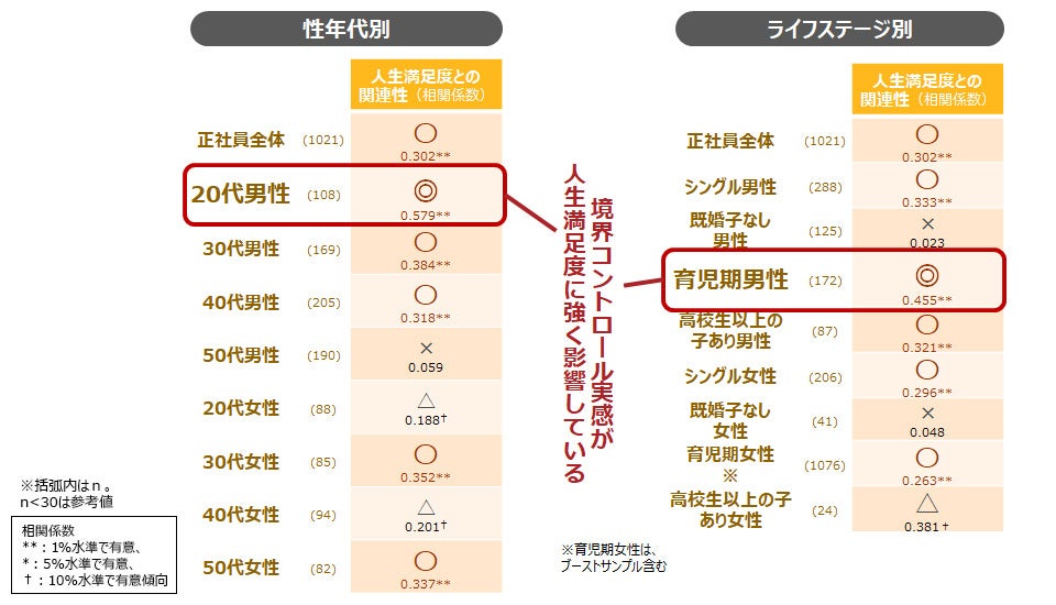 3. 特に、20代男性や中学生以下の子どもがいる育児期男性で、境界コントロール実感が人生満足度と強く関連している。