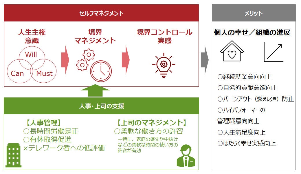 個人が仕事と私生活の境界を管理するために時間や物、対人関係、感情などを制御する「境界マネジメント」を行うことは、従業員の離職防止や自発的貢献意欲の向上といった組織成果の観点からも本人にとってのWell-beingの観点からも重要だ。