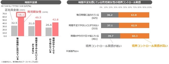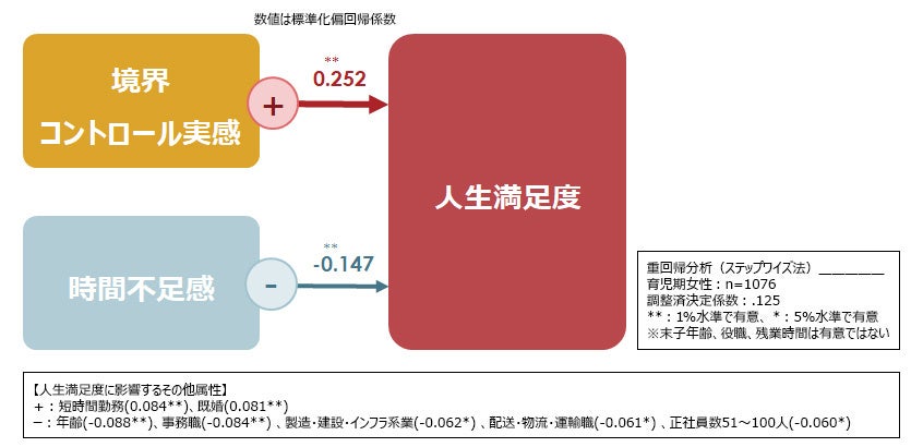 特に、仕事と育児の両立が課題となる育児期の女性は、時間不足を感じやすい。しかし、時間不足の解消と境界コントロール実感の向上は別々に考える必要がある。育児期の女性が人生の満足度を高める上では、時間不足を解消することも大切であるが、それ以上に、境界コントロール実感を高めることを意識して境界マネジメントを実践すべきである。